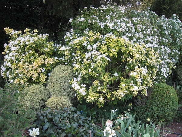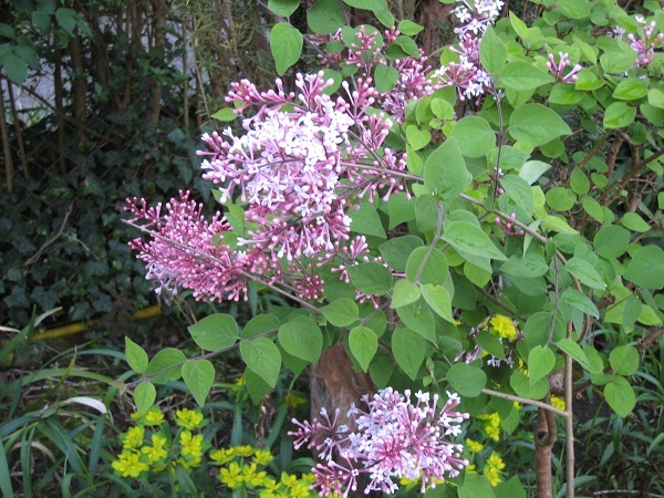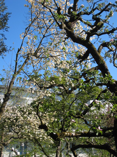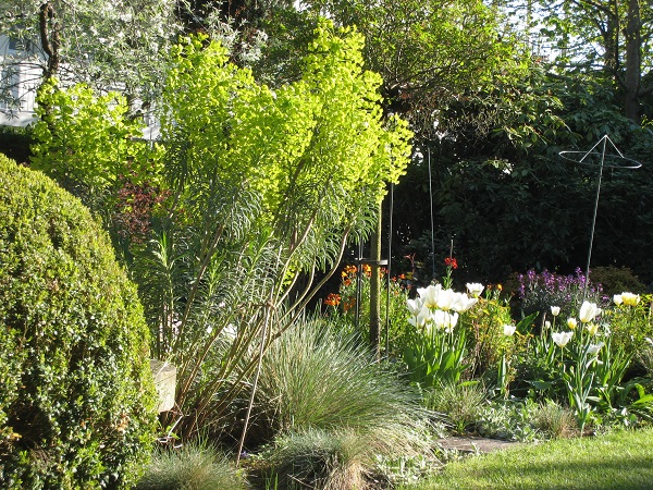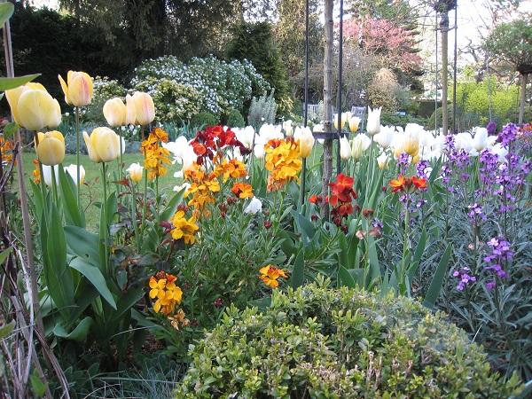 Nun wird es immer farbiger! Beim Gang durch den Garten begegne ich verschiedenen Düften wie Osmathus, Erysimum (Goldlack), Viburnum (Schneeball).