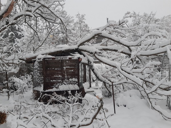 Leider ist in der Nacht vom 14.1. ein grosser Ast von der Paulownia auf das Treibhaus gefallen. Ich musste alle Pflanzen notfallmässig in den Wintergarten zügeln. Der Schaden ist noch nicht genau absehbar, nun liegt eine grosse Blache auf dem Treibhaus. Es gab noch weitere Baumschäden im Garten.